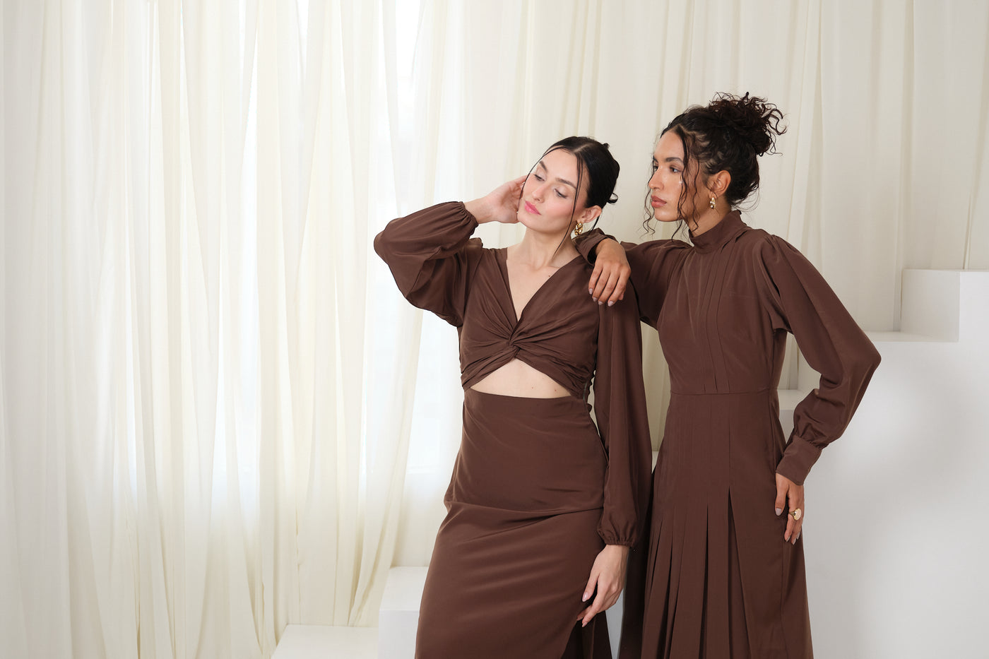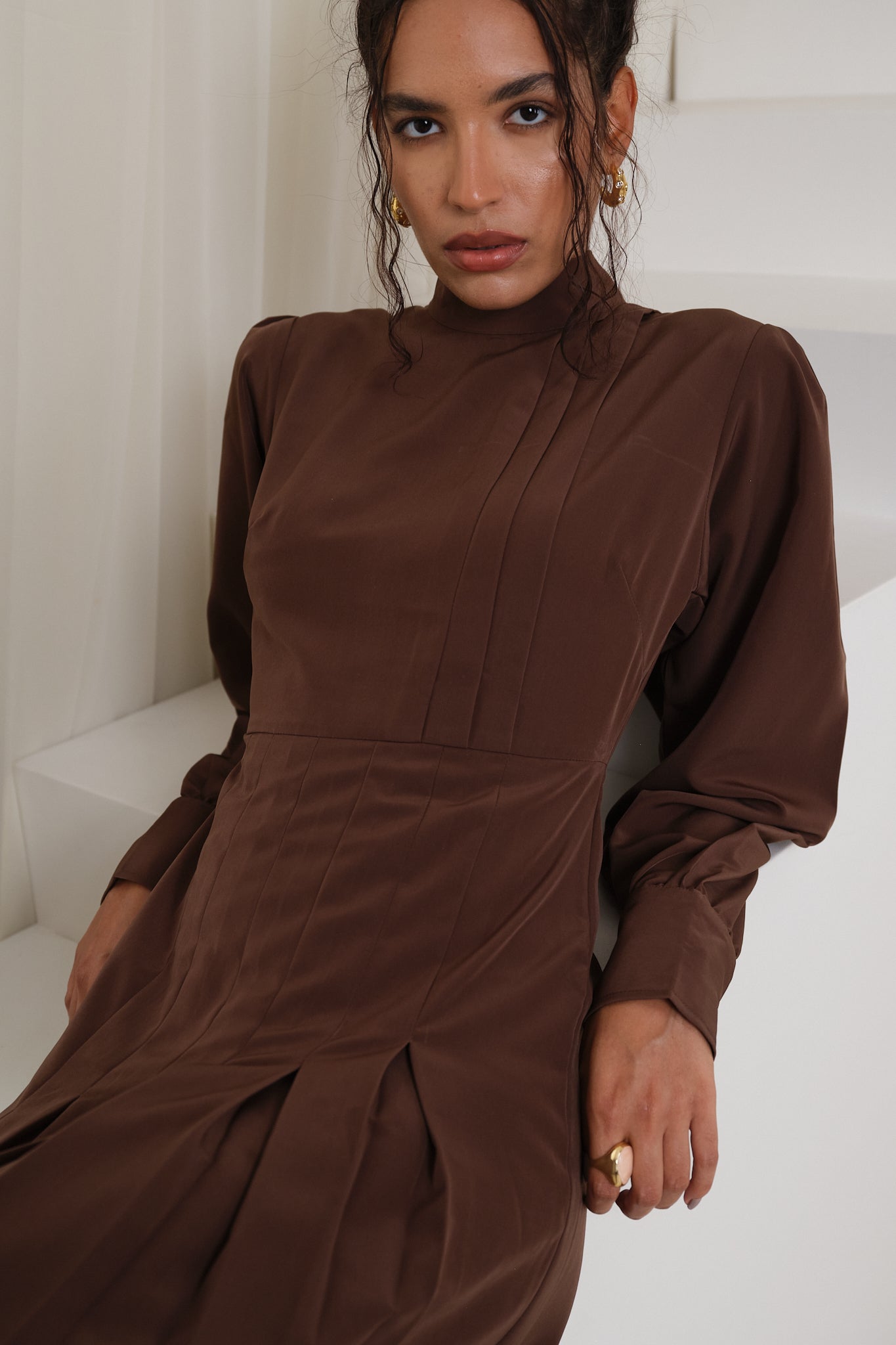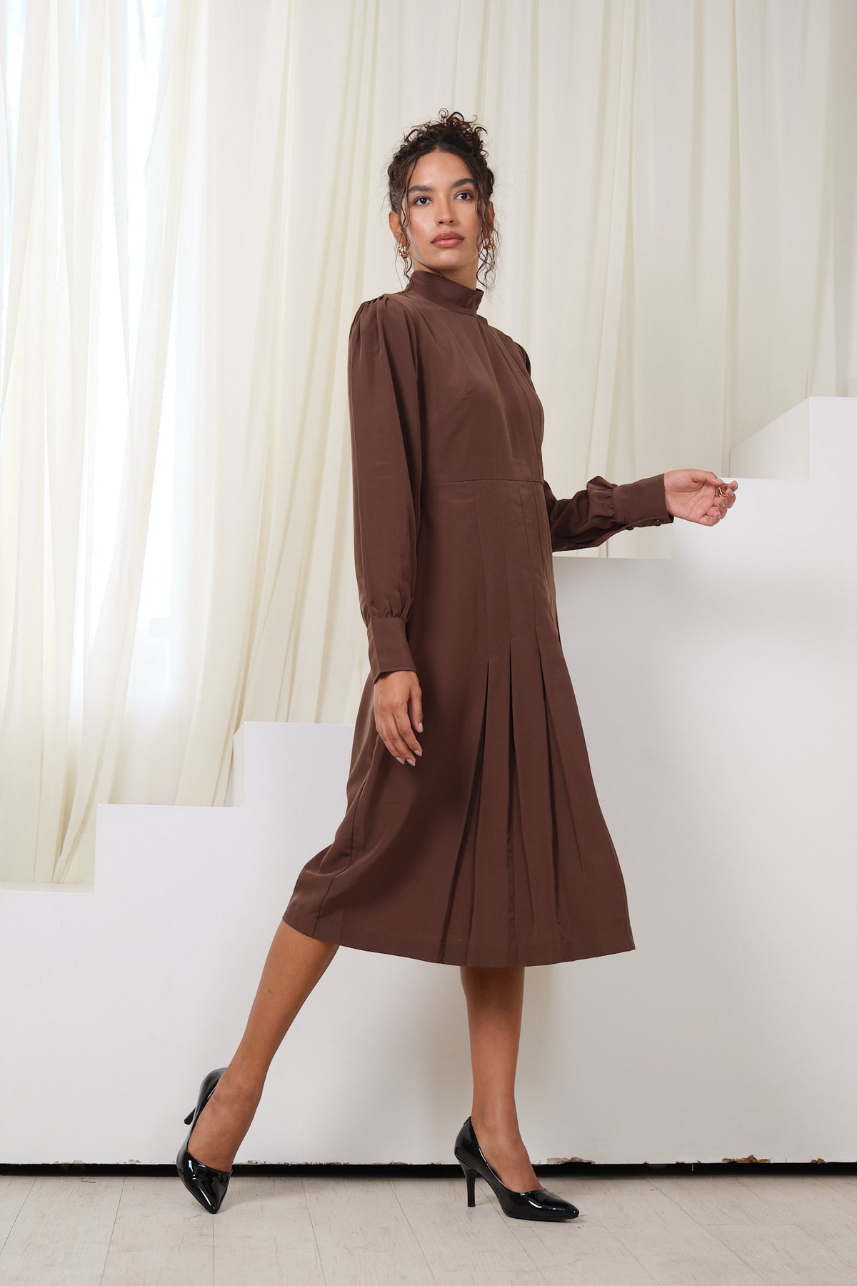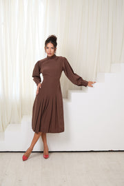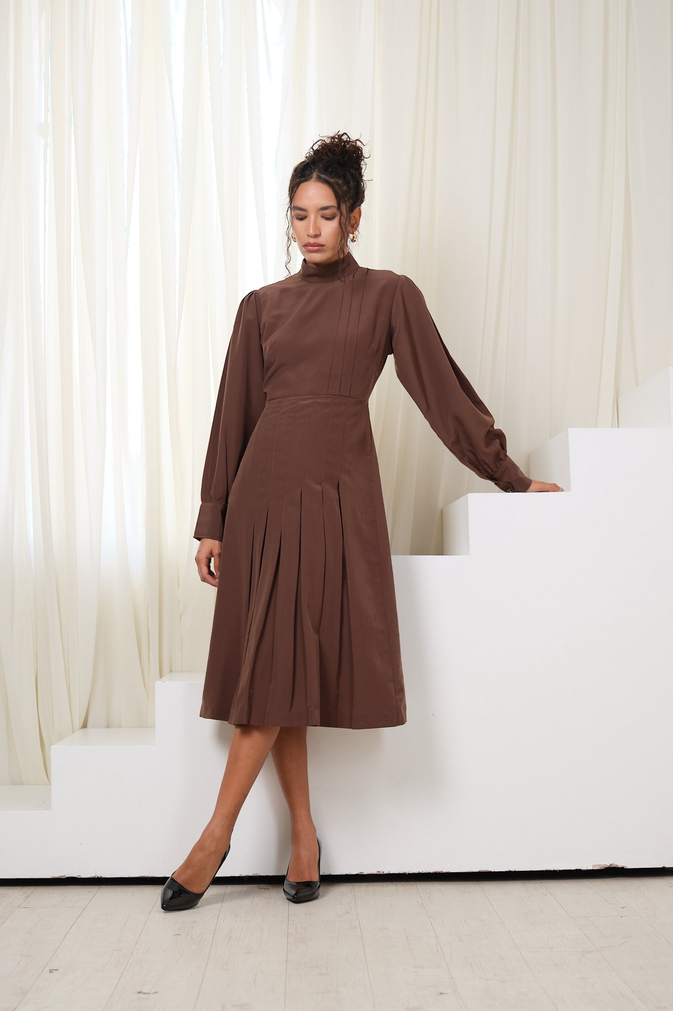 Tailored at the waist, stitched with pressed pleats through the front, and finished with a high neckline and soft volume sleeves. The fabric holds its shape but doesn’t feel stiff — it moves, breathes, and wears well from morning to evening.The kind of dress you can take seriously without it feeling too serious.