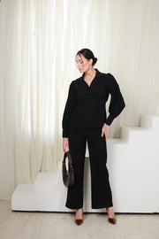 The top features a V-neckline with pintuck detailing, raglan sleeves, and elongated cuffs for a sculpted silhouette. Paired with straight-leg trousers that fall effortlessly from the waist, the look captures refined femininity with understated modernity.