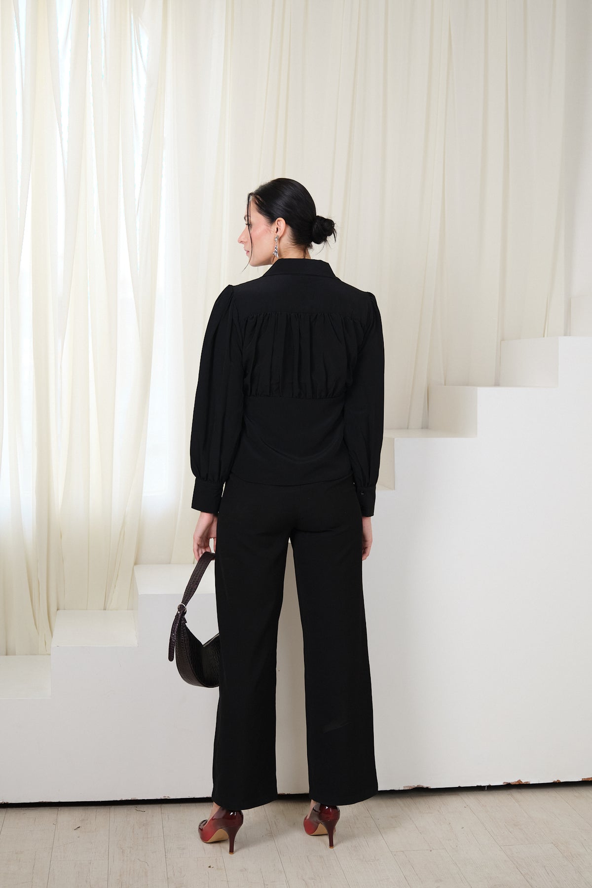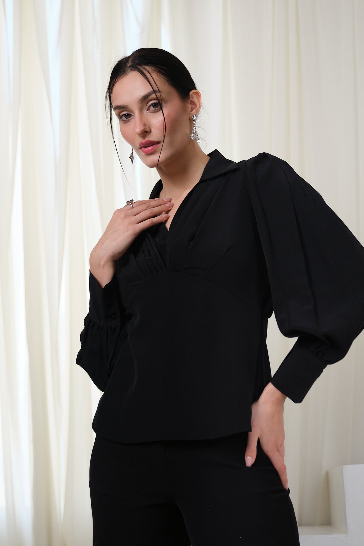 The blouse features a sculpted silhouette with a V-neckline framed by a soft collar. Fine pintucks radiate from the neckline, shaping the bust and adding textural depth. The  bishop sleeves gather into sharp, buttoned cuffs, balancing softness with tailorevoluminousd precision. Subtle gather detail at the back yoke create ease for movement without redefining structure
