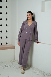 This Tailored set features a double-breasted top with a wide notched collar, relaxed shoulders, and clean button fastening — balanced by straight-cut trousers. The silhouette sits between ease and intention, polished yet unrestrained