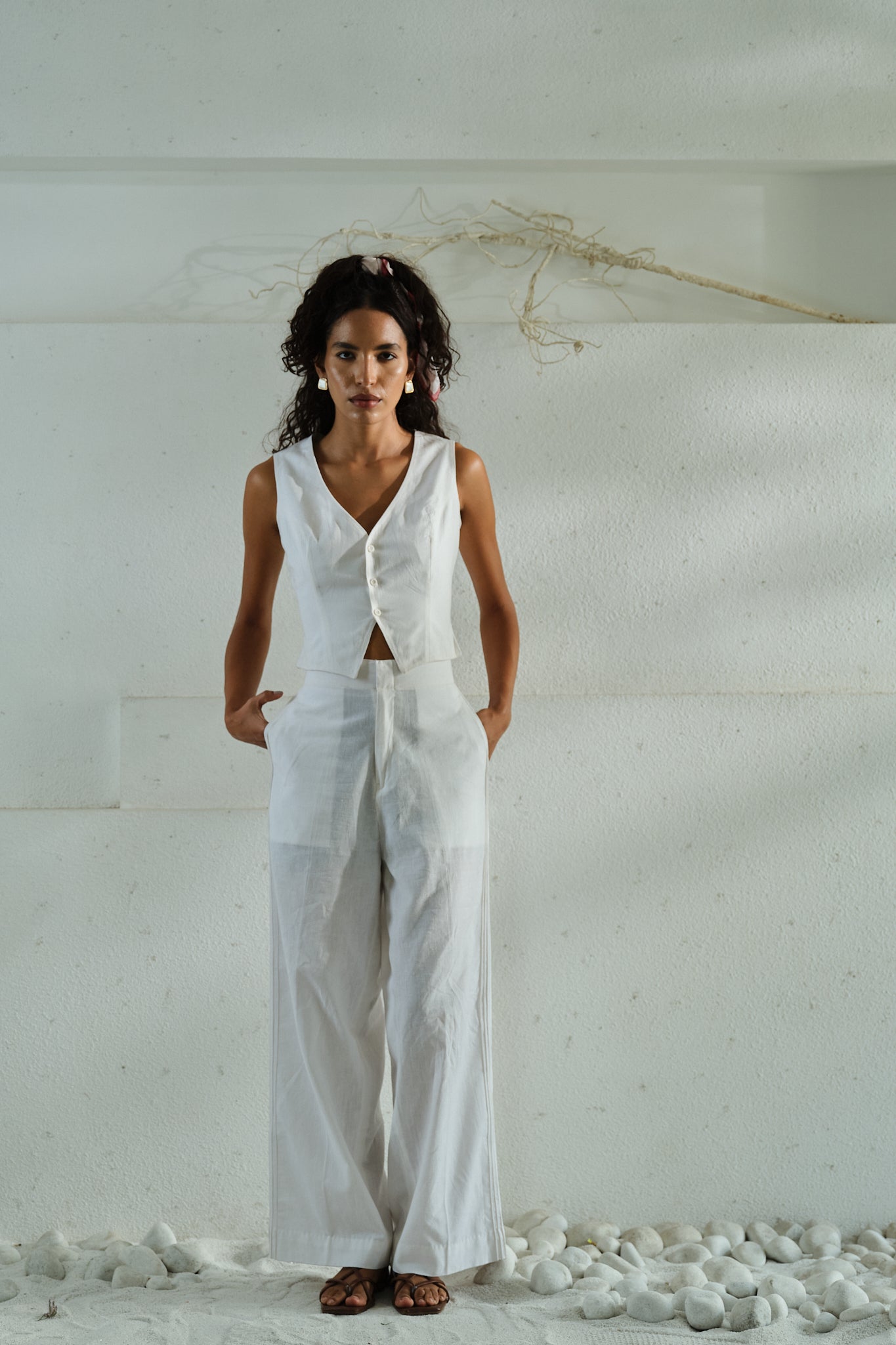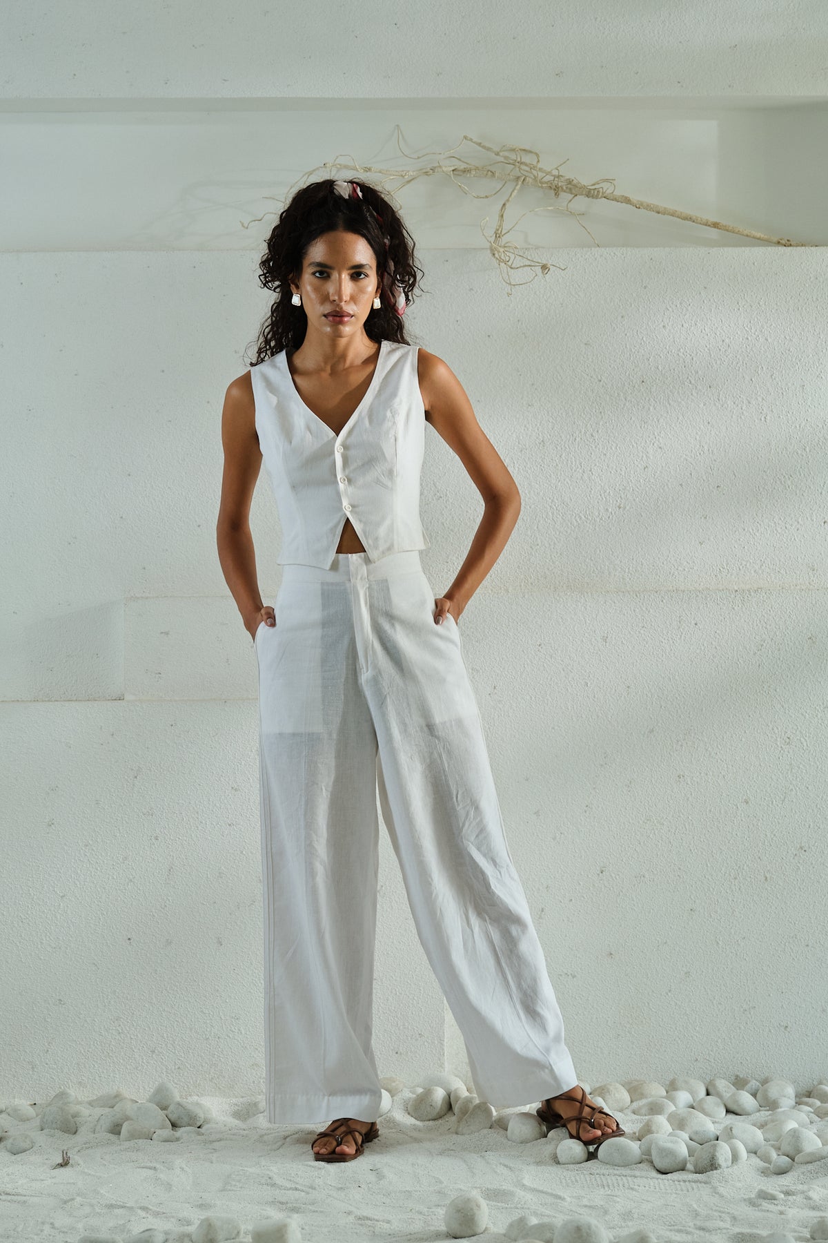 An all-white set where minimalism meets meticulous tailoring. Straight pants with subtle side seam pin-tucks pair with a short, buttoned waistcoat. Both crafted in lightweight, breathable fabric for all-day comfort. Clean lines, minimal detailing, and precise tailoring create a refined balance of ease and understated luxury.